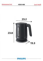 الموديل : HD931490 – نوع المنتج : غلاية – الطاقة = 2020 واط – السعة – 1.7 لتر – أداة تسخين مسطحة لغليان سريع وتنظيف سهل – الحماية من الغليان حتى جفاف المياه لضمان سلامتك – غلاية من دون أسلاك مع قاعدة تدور 360 درجة – مؤشر مستوى المياه للغليان بكفاءة – غطاء كبس لإعادة التعبئة بسهولة – فلتر قابل للفك للحصول على مياه خالية من الصدأ وتحضير مشروبات ممتازة