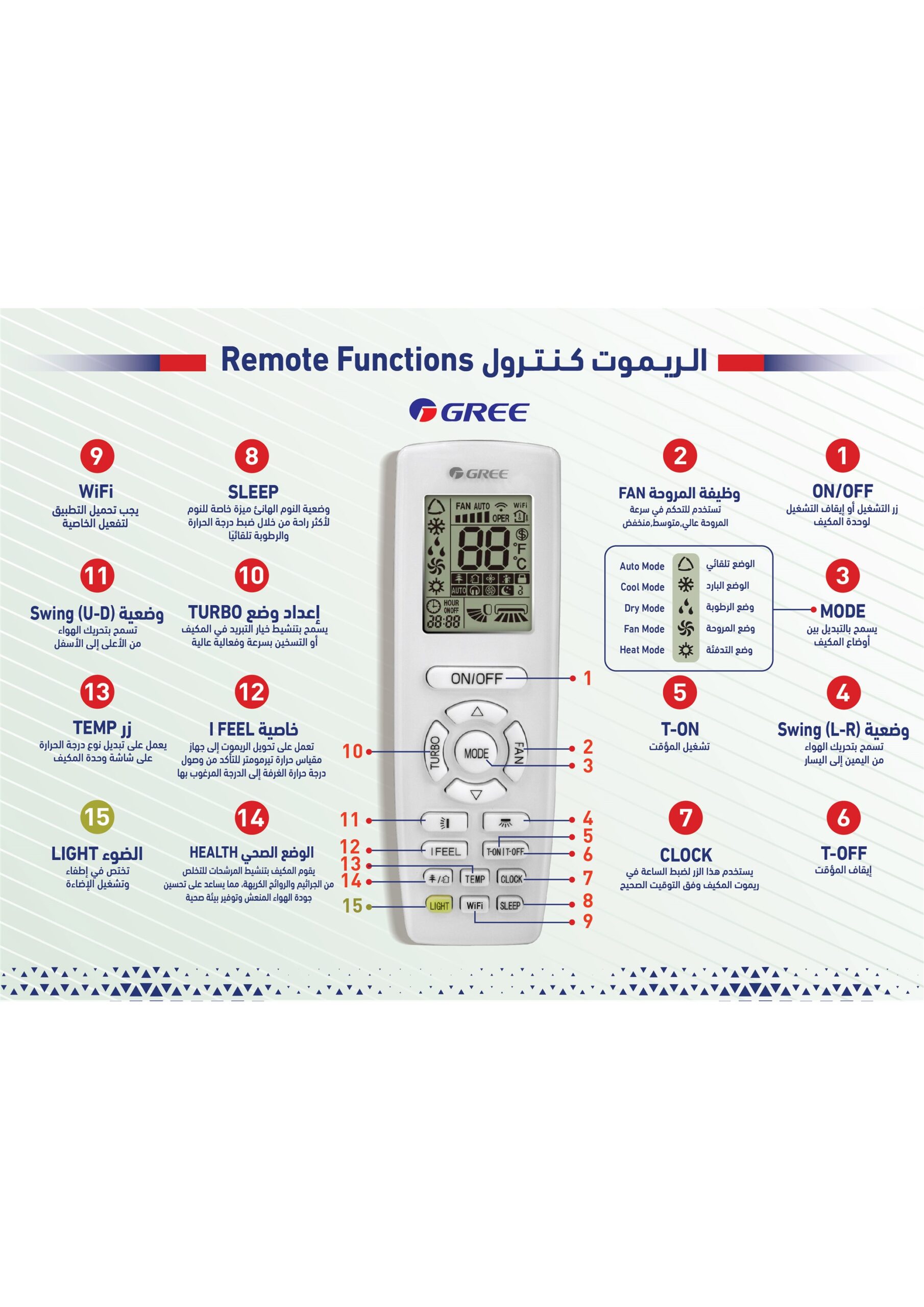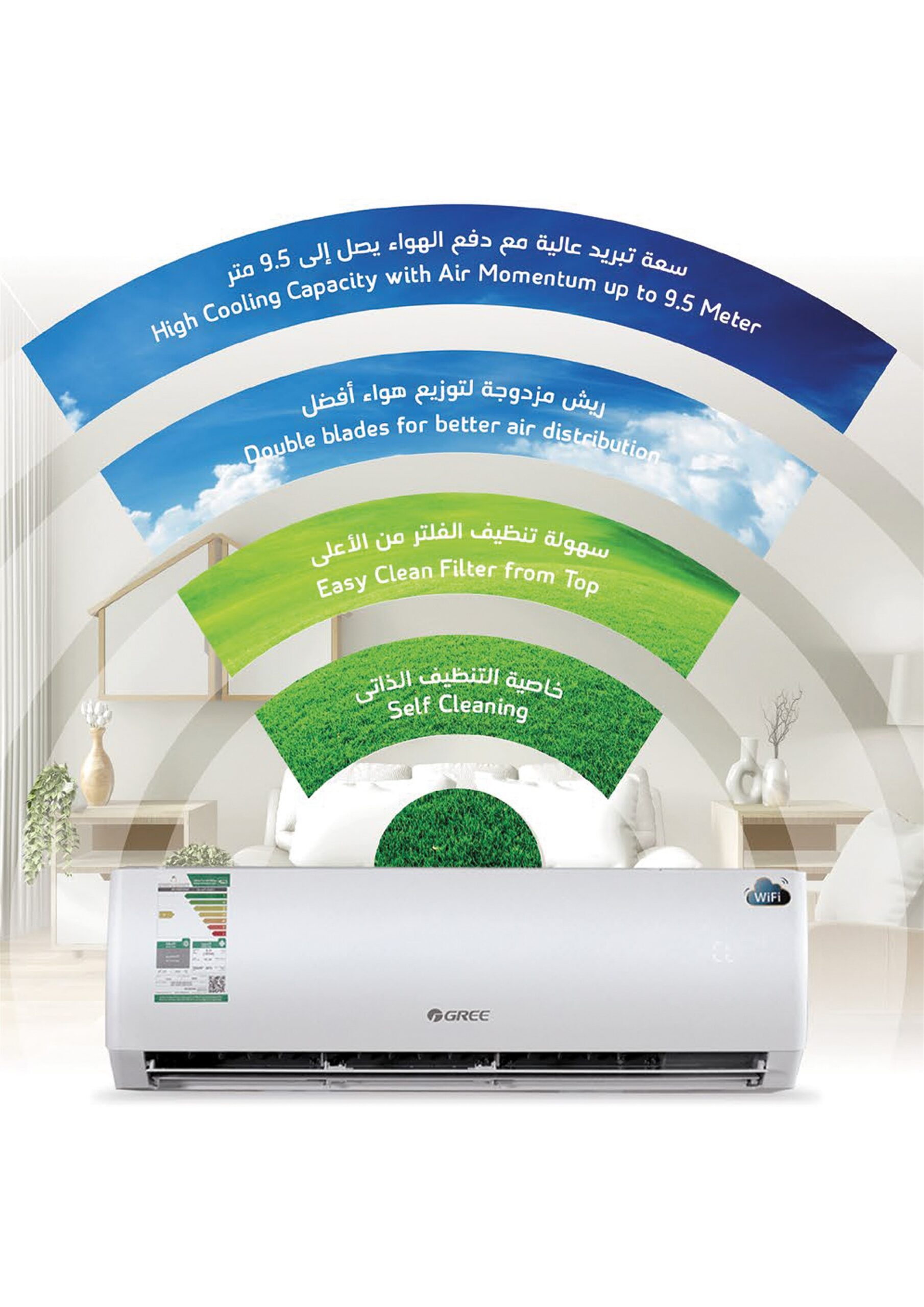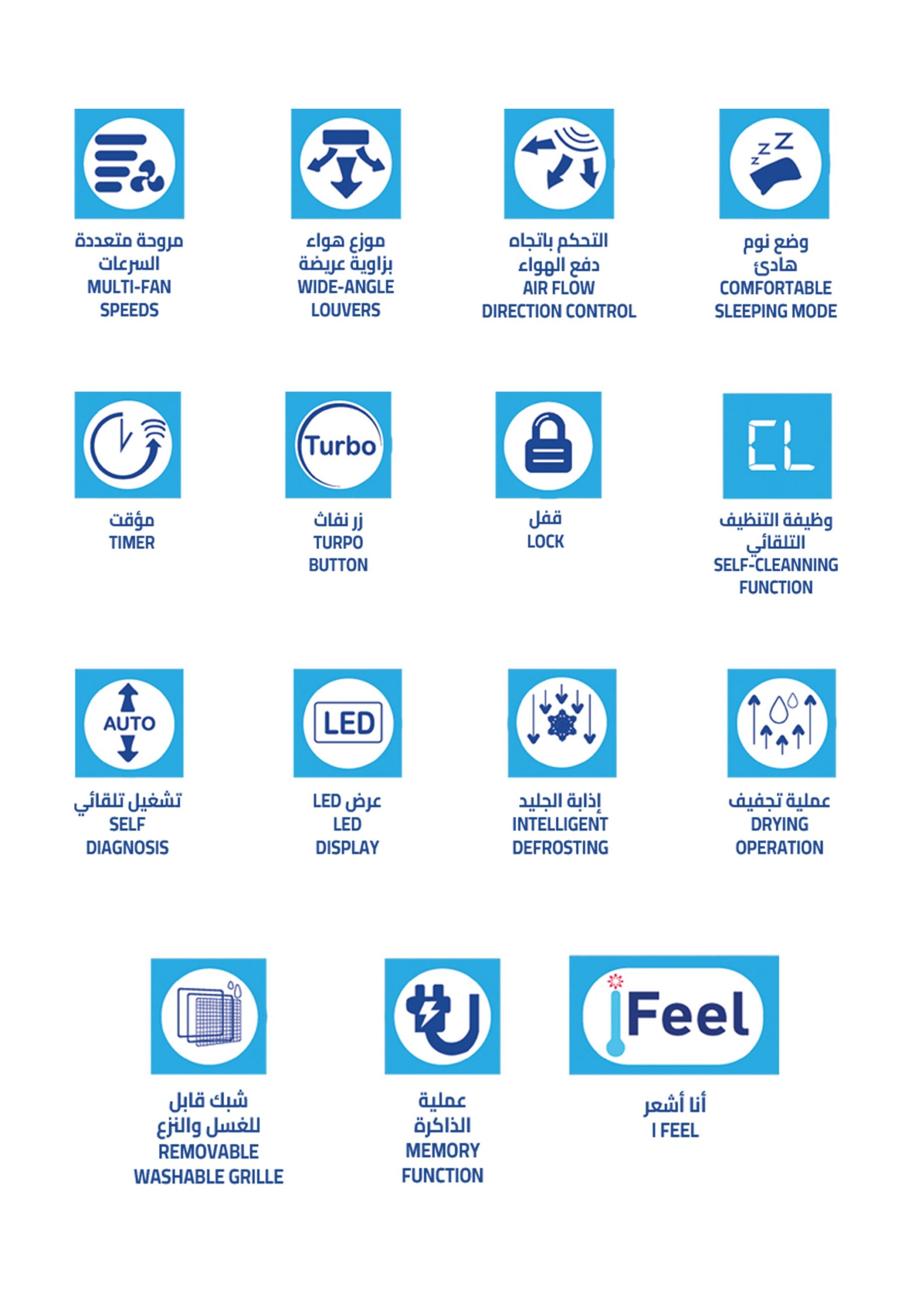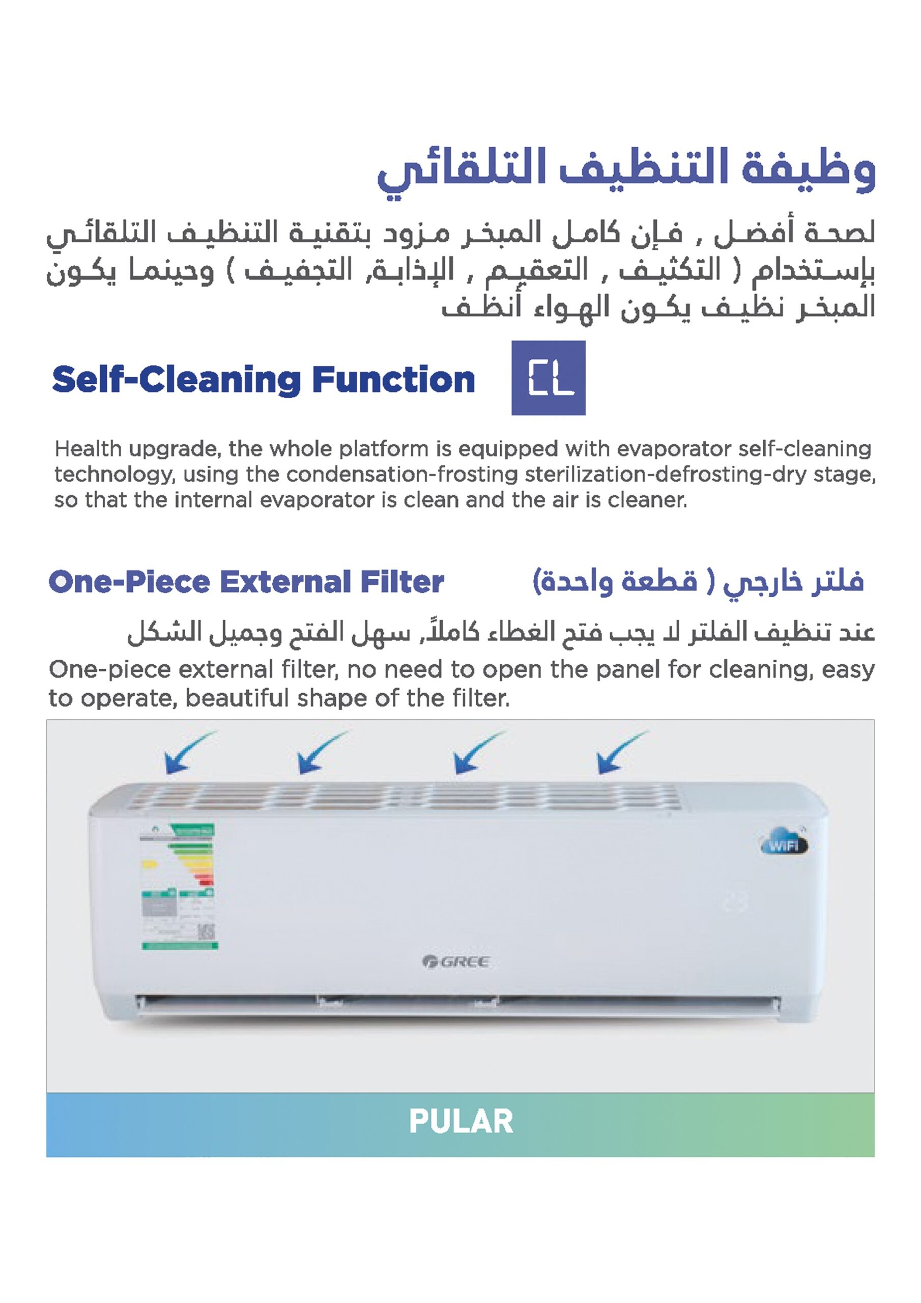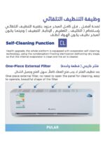نوع المنتج : مكيف – وظيفة التنظيف التلقائي ، فلتر خارجي (قطعة واحدة ) ، سعة تبريد عالية مع دفع الهواء يصل إلى 9.5 متر ،ريش مزدوجة لتوزيع هواء افضل ، سهولة تنظيف الفلتر من الأعلى ،خاصية التنظيف الذاتي ،مروحة متعددة السرعات ، التحكم باتجاه دفع الهواء ، وضع نوم هادى ، مؤقت ، إذابة الجليد ، عملية تجفيف ، شبك قابل للغسل والنزع ،عملية الذاكرة